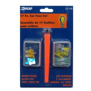 Car Fuse Set When fuses blow out they light up CONTENTS: 2 pc. 5 amp 2 pc. 10 amp 3 pc. 15 amp 4 pc. 20 amp 3 pc. 25 amp 2 pc. 30 amp 1 pc. Fuse Puller