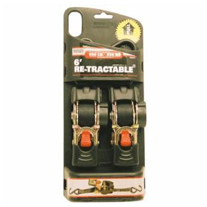 Rachet/Cam Straps Retractable Tie Downs Excess webbing stored in spring loaded housing similar to a tape measure Max. load - 1500 lb Working load limit- 500 lb 1" x 6' black webbing