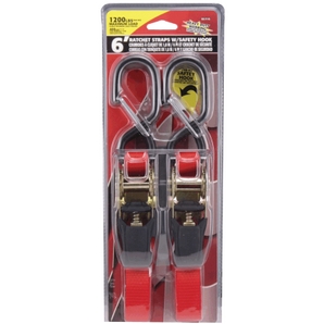Rachet/Cam Straps 1" x 6' motorcycle strap 1200lb. breaking strength 400lb. working load limit Strong red polyester webbing Rubber handle ratchet Extra long vinyl coated safety snap hooks Hook locks over 1" diameter tubing
