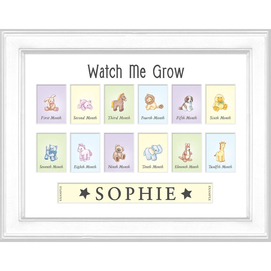 Watch Me Grow 12 photo openings each are 1.5"w x 2"h. Easel and sawtooth back Personalize this frame with the provided sticker sheet, to display child's name. Display pictures of child's first 12 months Wipe glass and frame to clean