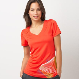 Reebok's Play Dry technology wicks moisture to keep your workouts extra comfortable. Polyester with Play Dry technology Moisture wicking Semi-fitted: Slightly fitted to follow your curves without being snug V-neck, Left arm heat sea... Read more
