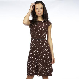 Great for the office or an evening out. 95% Polyester, 5% Spandex Semi fitted, length: to knee Swing bottom Brown with ivory dots Cap sleeves for extra coverage Zipper at back Dry clean 1/2 lined