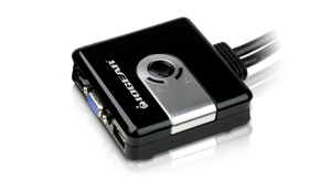 The IOGEAR 2-Port Compact USB VGA KVM allows users to share a VGA monitor, USB mouse, and USB keyboard between two computers. It supports multiple operating systems including Windows, Sun, and Mac.