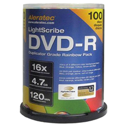Aleratec DVD-R 16x LightScribe v1.2 Duplicator Grade Rainbow 100-Pack media is optimized for LightScribe Direct Disc Labelling and use in demanding professional duplication applications. Contains 20 each of blue, orange, yellow, green and re... Read more