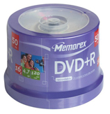 MEMOREX DVD+R 16X 50PK SPINDLE 4.7GB 2 Hours of video 16x Write speeed DVD+R 25 Pack Used with Recordable Drives that support DVD+R media The DVD+R disc is write-once, single sided and can store up to 4.7GB of data 2 hours of video