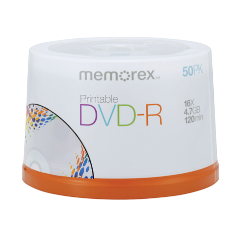 Memorex 50-Pack 16X 4.7GB Printable DVD-R Memorex Ink Jet Printable Surface DVD-R allows you to print directly onto DVD-R discs using direct printing ink jet printers, providing a professional disc print. Transfer home movies from VHS or 8m... Read more