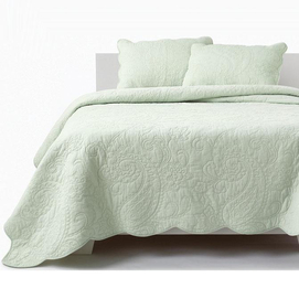 Quilt ; floral paisley pattern reverses to solid colour twin measures 68" w. x 90" l., double/queen 90" w. x 90" l., king 108" w. x 96" l. 2 Shams ; tie closure standard size twin has 1; king has 2 king-size shams 16" Sq. Cushion ti... Read more