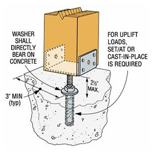 Elevated Post Base Hole drilled into post for adjustability For uplift loads, epoxy or cast-in-place is required Can be used to secure 4" x 4" wood posts to either pier blocks or cast-in-place concrete Material: 12 guage base, threaded ro... Read more