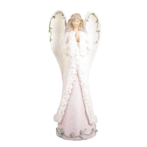 Angels White angel covered in glittery snow with subtle pink accents and soft white fluffy trim along the edges of her robe with her hands together in prayer Subtle addition to your winter angel display