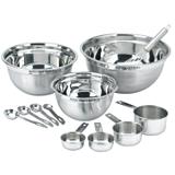 Contains three stainless steel mixing bowls (1½ qt, 3 qt and 5 qt), one whisk, four measuring spoons, four measuring cups 14/4 grade stainless steel is durable and easy to clean Dishwasher-safe