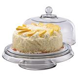 Four-in-one versatility: use as a covered cake stand with footed base, footed serving platter without the cover, footed punch or salad bowl or chip and dip plate Clear glass design and silhouette fit any home decor Dishwasher-safe