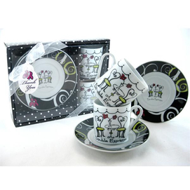 Designer-themed set of cup and saucers for wedding or party guests. Includes complimentary Thank You tag Comes complete with gift presentation box including ribbon Made from ceramic Packaged dimensions: 7" x 2¼" x 5¼" (18 x 6 x 13½ cm) Onlin... Read more