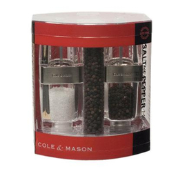 Fully adjustable mechanism, from fine to coarse grind Simply tighten or loosen the knobs. Uses Sea Salt and whole peppercorns Mills measure 7.5''/19cm h.