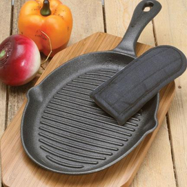Cast Iron pan with bamboo platter and handle mitt Pan measures 14.5''/37cm X 8'' /20.5 cm. Tray measures 12.5''/31.5cm x 7.5''/ 19 cm Pan Handel Mitt measures 5.5''/14.25cm x 2.75''/7cm