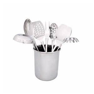 8 Piece Stainless Steel Tool Set Made from solid stainless steel Components include: solid turner, slotted turner, solid spoon, slotted spoon, spaghetti server, ladle, fork and utensil holder Dishwasher safe 16" H x 6" W