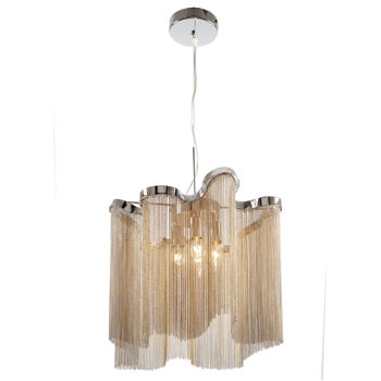 This 4 light chandelier features waves of elegantly draped chains with an exquisite polished nickel finish. This pendant is perfect for brightening a dining room, entryway or plush master bedroom giving it a glamorous and romantic appeal. Features:... Read more