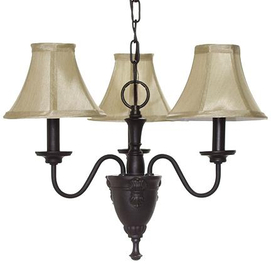 brushed gold finish chandelier with ivory silk-like material uses three 40W candelabra base bulbs and includes a 3 ft. chain 8.25'' l. x 18.50'' w. x 13.00'' h.