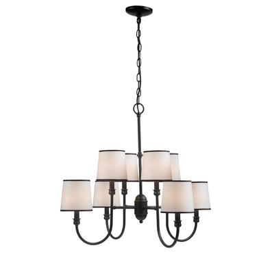 Simple, warm and inviting would describe this simple chandelier. Hard back linen shades trimmed in brown are included . Our signature Euro finish is the perfect combination to accent any décor. Euro bronze finish ADA compliant Uses 8 candelabr... Read more