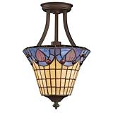 Decorative 3-light semi-flush mount light with antique copper gold finish Features colourful Tiffany glass shade Dimensions: 18 w x 22" h (46 w x 56 h cm) Requires three 100W (max) medium base bulbs(52-5451) or 23W CFL bulbs (52-5121)(no... Read more