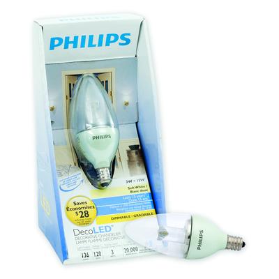 Philips LED Decorative chandelier. Energy savings and long life. Dimmable soft white light. Instant-on light. Mercury and RoHS compliant construction. Similar size and shape as regular bulb. Will not fade fabrics or furnishings. Ideal fo... Read more