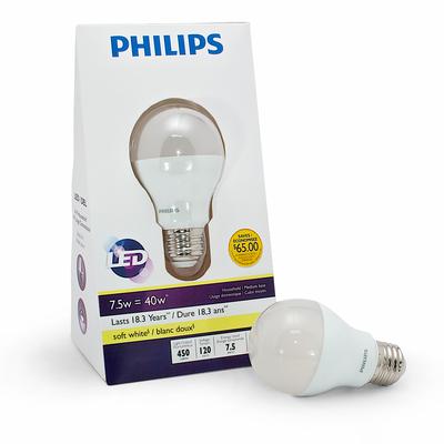 Philips LED Household bulb. Energy savings and long life. Bright white light. Instant-on light. Mercury and RoHS compliant construction. Similar size and shape as regular bulb. Will not fade fabrics or furnishings. Ideal for table and floo... Read more