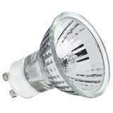 Halogen reflector. 120 V. 20 W. GU10 base. PAR16 type. Made of aluminum. Clear. 2 per box. Also offered in 35 W and 50 W.