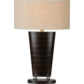 This unusual lamp has a resin body with a light and dark brown striped finish resting on silver leafed balls and a brown oval base with matching brown cord. It has a beige trimless oval linen shade and a tri-light socket. Dark/Light Brow... Read more
