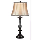 Decorative table lamp with shiny espresso finish Features grey bell shade with trim Dimensions: 14 w x 29" h (35 w x 74 cm h) Requires one A21 150 W medium base (52-5681) or one 15/24/40W CFL medium base bulb (52-5140) (not included)