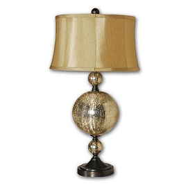 Antique crackled glass and was bronze plated metal. Round bell silk shade with double trim and matching finial. Tri-light socket. Height: 29''