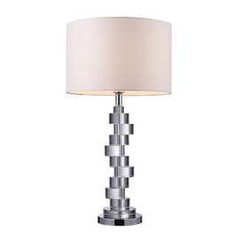 The Trendsitions table lamp's chrome and crystal base catches the light. The stacked design is a sleek design and maintains a refined look. The white round shade compliments the overall look.