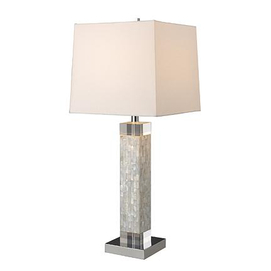 The Trendsitions table lamp has mother of pearl accents that are hand inlayed into a steel base and topped with lucite. The square shade enhances the shape of the pearl accents.