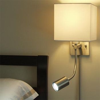 This Gen-Lite wall lamp features a brushed steel finish, with a medium base up light, an off white fabric shade and an adjustable gooseneck LED down light. The LED down light is ideal for reading, uses very little energy and gives off very littl... Read more