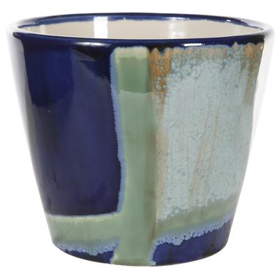 A flared cache planter with an abstract design that brings the Far East to mind. The reactive glazes and neutral colors create a feeling of serenity. No Drainage Hole Indoor use Holds 5" grower's pot