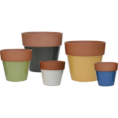 The warmth of clay with the colors of today. Classic flower pot shape in a glazed terra cotta. Choose from an assortment of colors highlighted by a terra cotta rim. Drainage Hole Available in five colors Not Frost Resistant Indoor or outdoor use