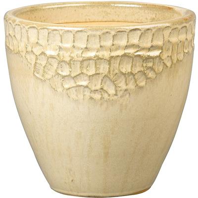 Tall cup pot with a dimpled rim design. A creamy beige glaze serves as a neutral accent to foliage as well as flowers. Hole in bottom for proper drainage The high fired glaze makes this planter frost resistant Outdoor Usage