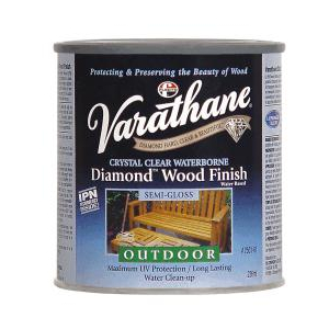 Waterbase Satin Varathane Crystal Clear Waterborne Diamond Wood Finish Outdoor (water based) Semi-gloss finish Provides a transparent, tough, flexible, and durable coating Testing shows that finish will provide maximum protection and durability... Read more