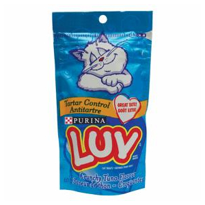 Treats Purina Luv Treats Tarter Control tuna Crunchy cat treat Re-sealable bag Guaranteed analysis: crude protein (min.) 24.0%,crude fat (min.) 8.5%, crude fibre (max.) 1.0% and moisture (max.) 36.0% 60g bag