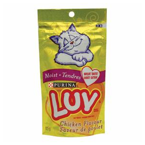 Treats Purina Luv Treats Chicken flavour Moist cat treats Re-sealable bag Guaranteed analysis: crude protein (min.) 24.0%,crude fat (min.) 8.5%, crude fibre (max.) 1.0% and moisture (max.) 36.0% 85g bag