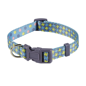 3/4" (19mm) wide collar fits 14 - 20" (36 - 51cm) neck size. Double-sided print of multicoloured dots and stars on blue background. Plastic closure, nickel-plated D-ring.