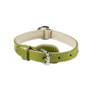 Genuine leather collar with nickel-plated D-ring and buckle closure. 5/8" (16mm) wide x 14" (36cm) long.