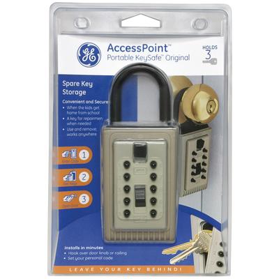 GE Portable KeySafe hangs easily on a doorknob, fence, railing, etc. Just open the lid, lift the shackle and hang. No tools needed! Holds up to 3 keys. Change the combination anytime for added security. Constructed of sturdy metal with a rubbe... Read more