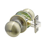 Hallway door knob. Made of steel. Antique brass finish. 2 3/4 in. to 2 3/4 in. adjustable latch. Mortise lock or drive-in latch installation. Limited lifetime warranty.