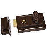 SIngle cylinder security night latch. Made of zinc. Brown. 5-year warranty on finish, 25-year warranty on mechanism.