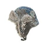Mossy oak camouflage hardwood rabbit faux fur bomber hat Brushed, water-repellent polyester/cotton Hat is made of rabbit faux fur trims and a quilted lining Sure-snap closure for snug fit and ear-flap storage Mossy Oak camouflage pattern