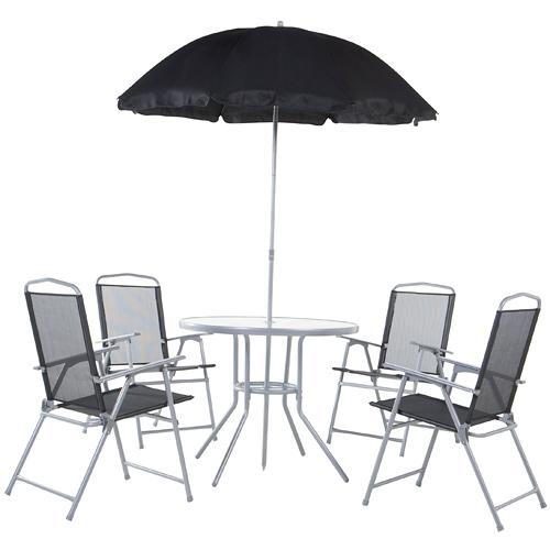 Patio set. 6 pieces. Steel structure. Including 34-in. round table, 4 folding chairs and a 6-ft umbrella. Grey and black.