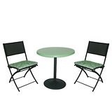 Bistro set. Steel structure. Includes 1 table and 2 folding chairs with cushions. Black and green. 1-year warranty. # NOT AVAILABLE IN WESTERN CANADA. #