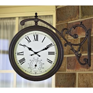 Bring the streets of Paris home. Inspired by lazy afternoons on cobblestone, this unique double-sided clock hangs from the wall with a strong and stylish bracket. Large diameter makes it perfect for large spaces, indoor or out. A thermometer on on... Read more