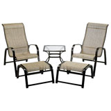 Patio set - 5-piece. Includes 20 in. x 20 in. x 17 3/4 in. with tempered glass top, 2 stackable chairs and 2 ottomans. Made of steel and material. Brown and beige.