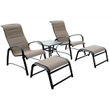 5-piece bistro set. Tempered glass table 20 in. x 20 in. x 17.5 in. Two chairs 29 in. x 37 in. x 25 in. Two ottomans of 22.5 in. x 23.5 in. x 13,5 in. Made of steel and sling. Dark brown. # NOT AVAILABLE IN WESTERN CANADA. #