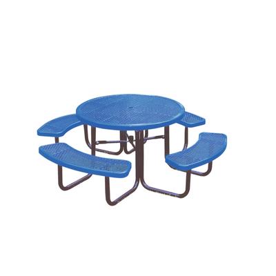 The 358 is a 46" table with 1-5/8" walk through design frame. Umbrella hole is standard. The 358 table with capri seats offers comfortable bench-style seating The 46" round table top and seat planking is thermoplastic coated steel with a diamon... Read more